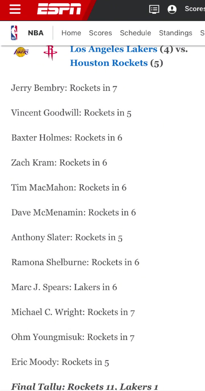 会有打脸吗?ESPN十一名专家有10人预测火箭晋级,仅一人看好湖人